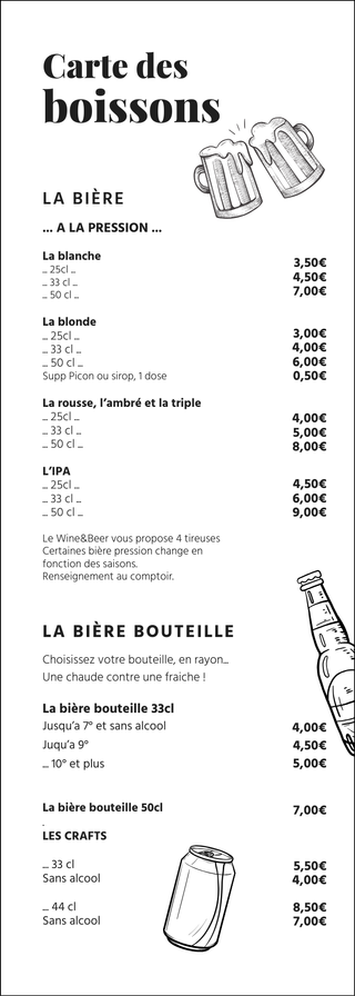 Profitez d'un large choix de bières bouteilles, canettes, pressions, vins, cocktails